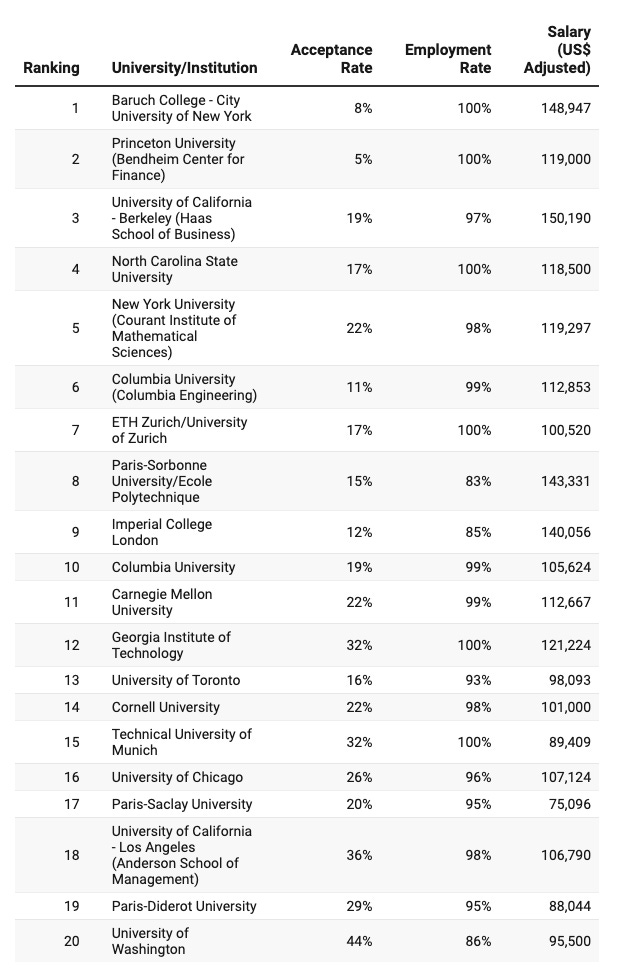 Baruch College is ranked top and has consistently ranked top for many years. Baruch is known for its rigorous curriculum as well as its industry connections. Furthermore, graduates of the Baruch program have a strong track record of securing high-profile positions in hedge funds and investment banks with a high average starting salary of $148k. In addition, its tuition fees are also relatively cheap at $42k compared to $125k for Princeton.